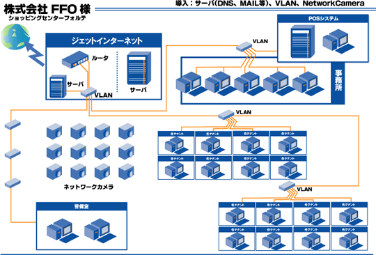 館内ネットワーク再構築に伴い、DNS,MAIL等のサーバを構築するとともに、各店舗のインターネット接続環境を整備した。その際、各店舗間の通信を遮断するためにVLANを導入した。 また、監視用カメラとして館内・館外の十数ヵ所にネットワークカメラを導入した。