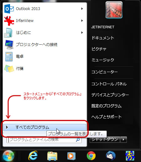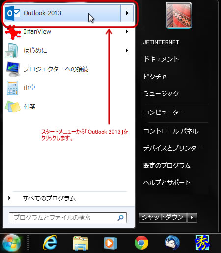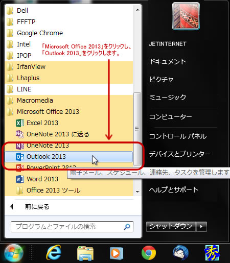 「スタートメニュー」に表示されていない場合には「スタートメニュー」より「すべてのプログラム」をクリックし「Microsoft Office 2013」をクリックして開き、「Outlook 2013」をクリックします。