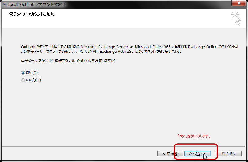 「電子メール アカウントに接続するように Outlook を設定しますか?」に対して「はい」を選択し、「次へ」をクリックします。