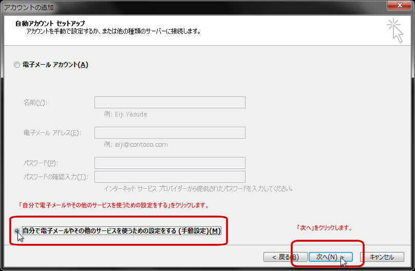「自分で電子メールやその他のサービスを使うための設定をする(手動設定)」を選択し、「次へ」をクリックします。