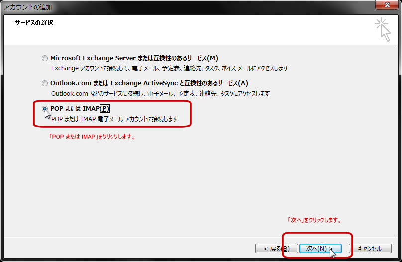 「POP または IMAP」を選択し「次へ」をクリックします。