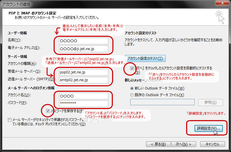 ※電子メールアドレスが○○○@jet.ne.jpの方は、「pop.jet.ne.jp」となります。