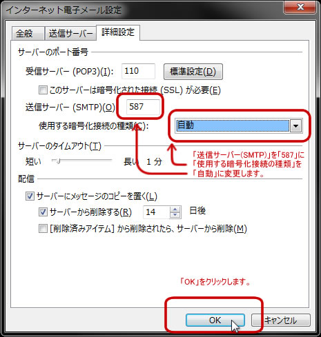 10.「サーバーのポート番号」の「送信サーバー(SMTP)」のポート番号を「25」から「587」に変更します。