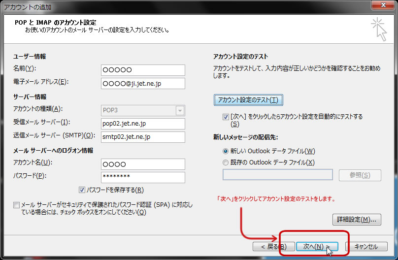 「「次へ」をクリックしたらアカウント設定を自動的にテストする」にチェックを入れます。