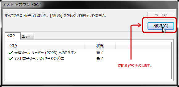 12.アカウント設定のテストが無事完了すると「受信メールサーバー(POP3)へのログオン」「テスト電子メールメッセージの送信」の「状況」が「完了」となります。
